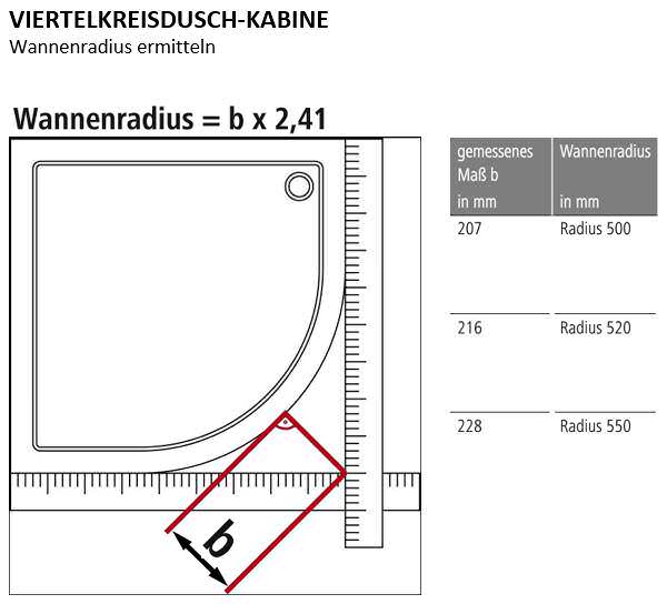 Das Beispiel betrifft eine sogenannte Viertelkreisdusche bzw. Runddusche. Bei „Halbkreisduschen“ erweist sich die Berechung des Radius indessen ein wenig komplexer und hängt von einigen Faktoren ab. Hierzu bitte einen Blick auf die hinterlegten Skizzen der Hersteller werfen, oder mit uns in Kontakt treten. Wir helfen gerne weiter. Gerne stehen wir Ihnen auch mit unserem Aufmaßservice zur Verfügung. In diesem Fall übernimmt unser Fachmann das Duschkabine ausmessen für Sie.